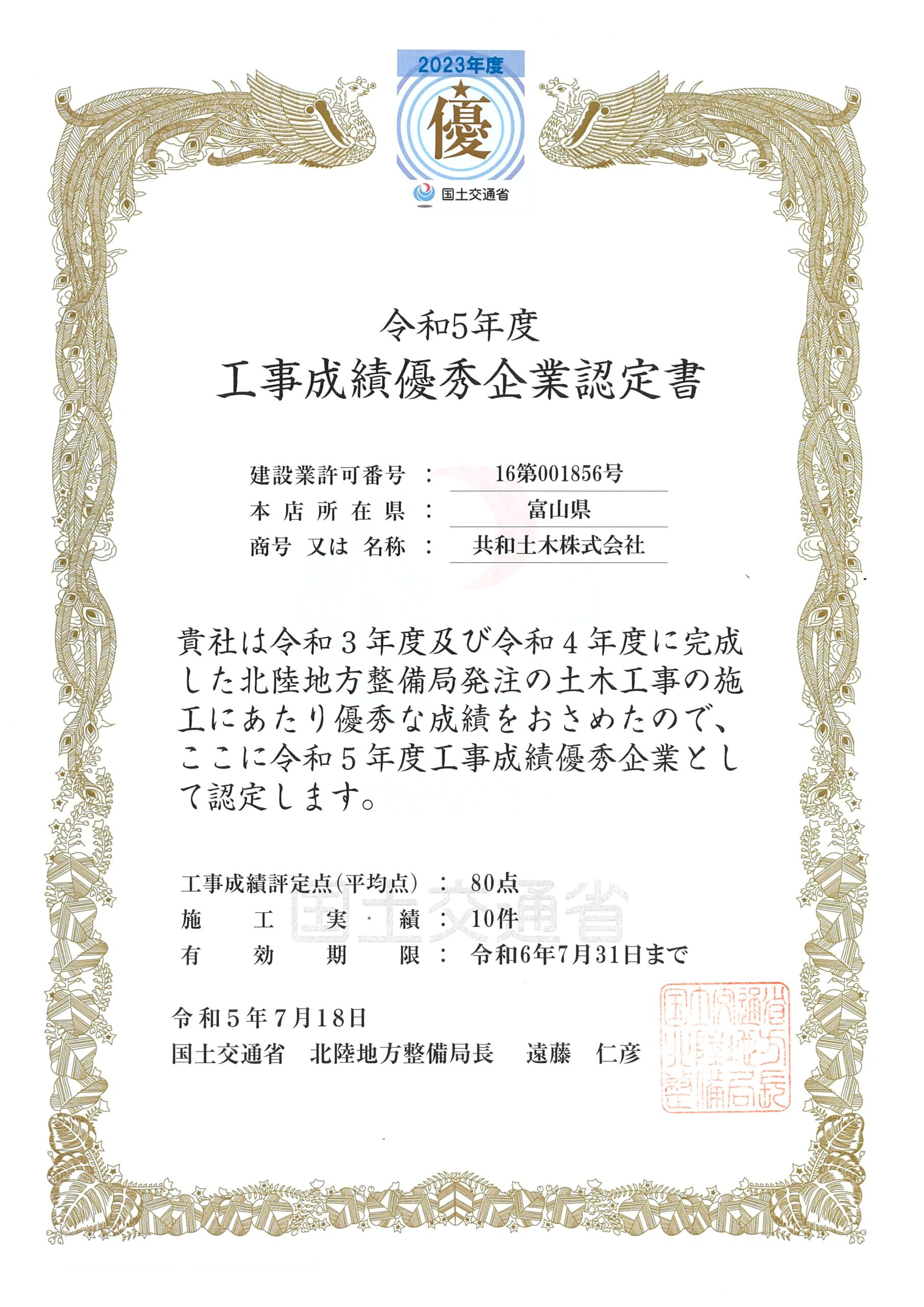 当社の土木工事の施工が評価され、北陸地方整備局より令和5年度の工事成績優秀企業として認定をいただきました。