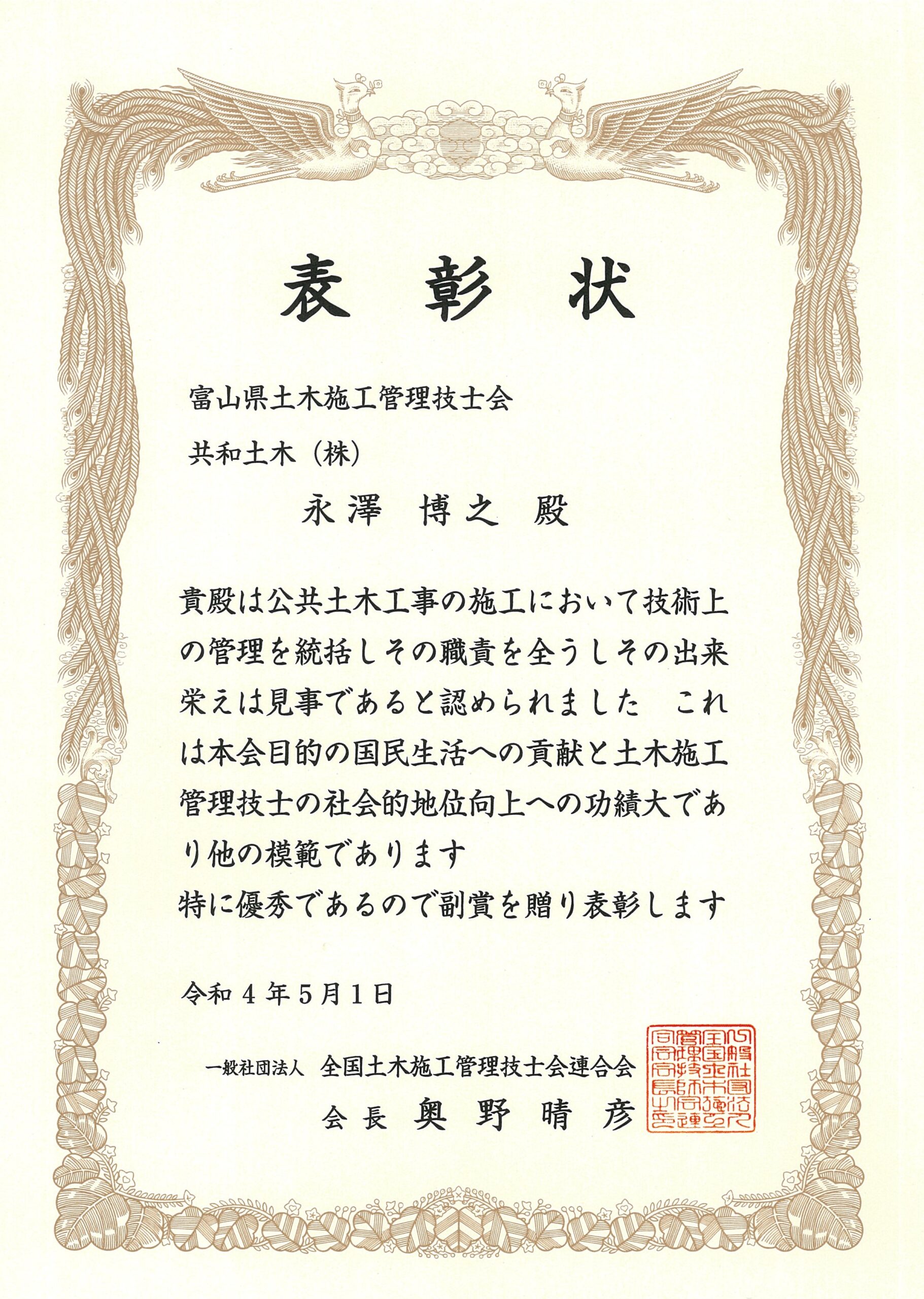 全国土木施工管理技士会連合会 会長賞 受賞 2022年7月15日 「ほ場整備出島地区第1工区ほ場整備工事」に従事した、永澤博之氏が全国土木施工管理技士会連合会 会長賞を受賞しました。 DSC_0028 前の記事令和3年度建設優良工事表彰次の記事富山県土木施工管理技士会優良技術者表彰 受賞 お知らせ一覧へ