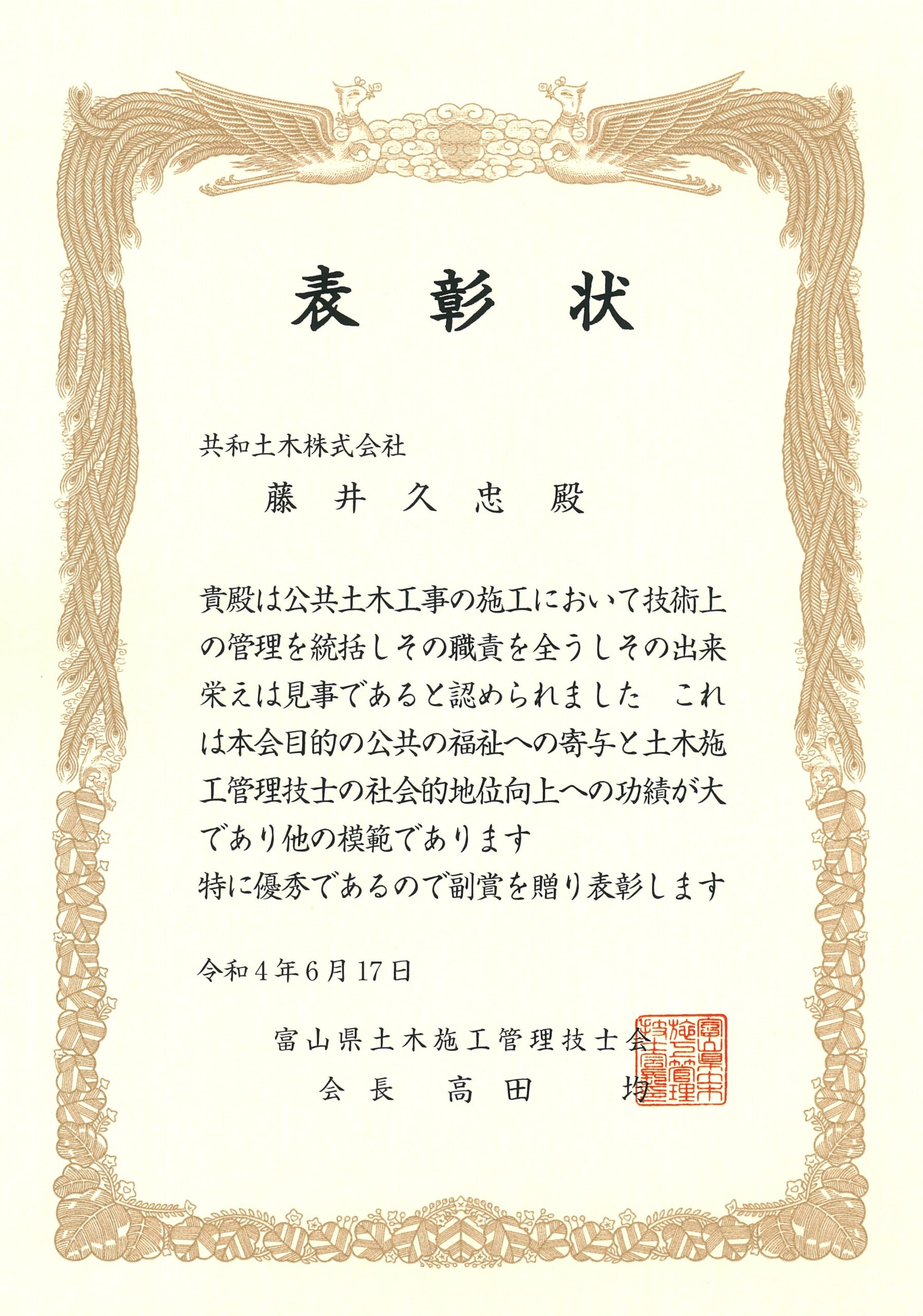 富山県土木施工管理技士会優良技術者表彰 受賞 2022年7月15日 「園家離岸堤(No106)その4工事」に従事した、藤井久忠氏が富山県土木施工管理技士会優良技術者表彰を受賞しました。 前の記事全国土木施工管理技士会連合会 会長賞 受賞次の記事令和4年度 工事成績優秀企業 認定 お知らせ一覧へ