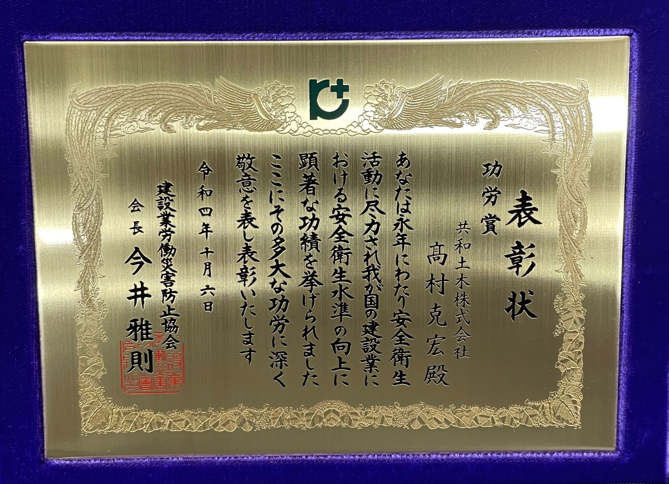 当社社長である髙村克宏氏の永年にわたる安全衛生活動が評価され、建設業労働災害 防止協会より功労賞を受賞しました。