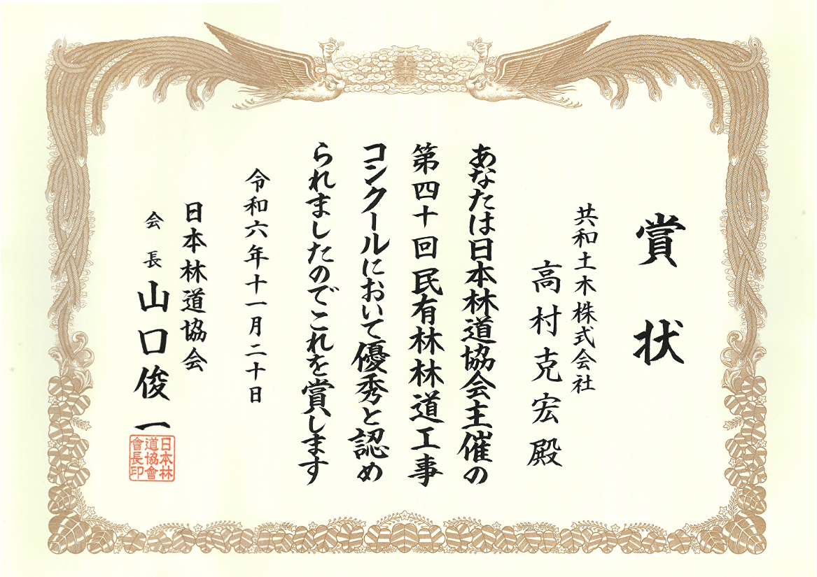 第40回民有林林道工事コンクール 優秀賞受賞! 2024年11月20日 第40回民有林林道工事コンクールにて、日本林道協会より 優秀賞をいただきました。 前の記事令和6年度入善土木事務所管内優良土木工事表彰 優秀賞受賞!次の記事令和6年度 富山県建設優良工事表彰(農林水産部長賞)受賞! お知らせ一覧へ