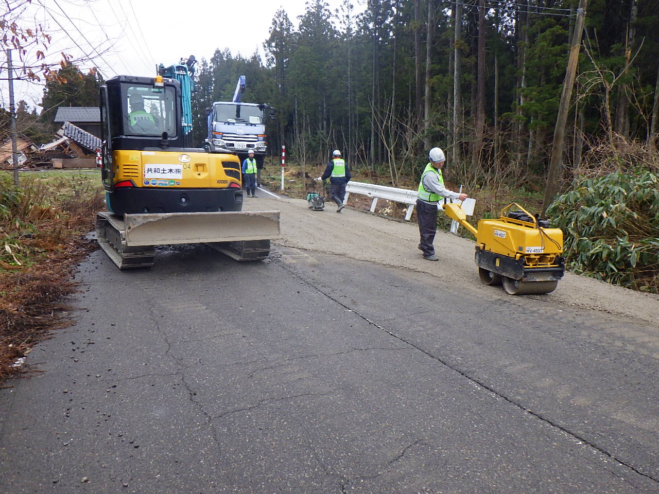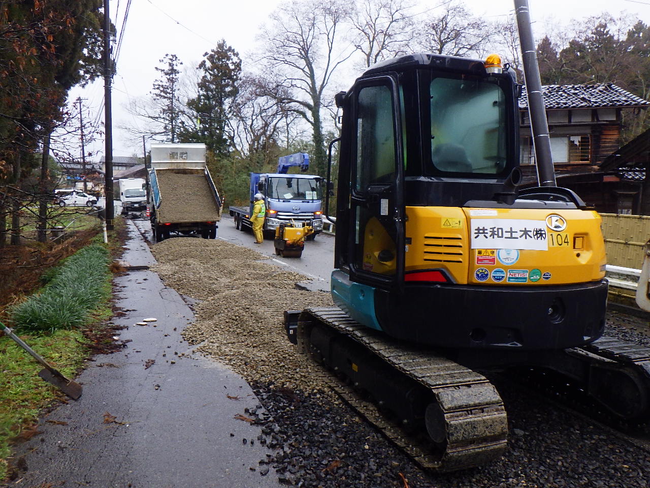 砕石を敷き均し転圧しています。仮復旧完了です。