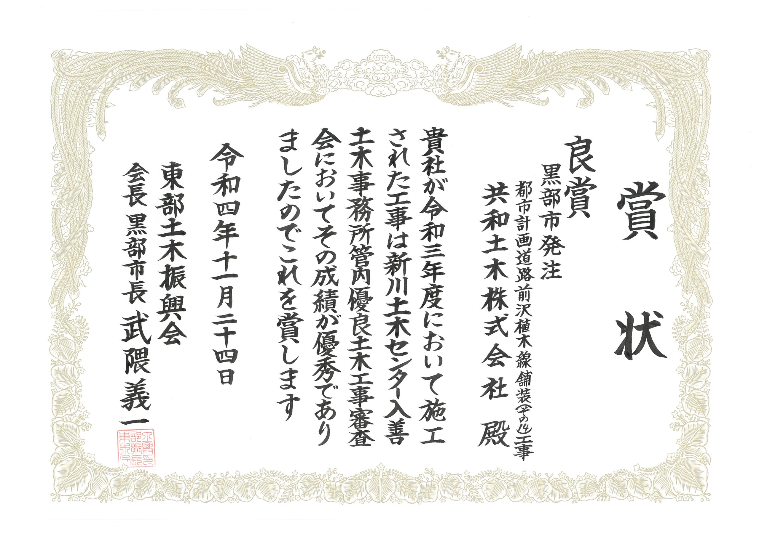 令和4年度 新川土木センター入善土木事務所管内優良土木工事表彰 受賞 2022年11月24日 令和3年度に弊社で施工した黒部市発注の「都市計画道路前沢植木線舗装(その14)工事」にて 東部土木振興会より良賞をいただきました。 前の記事「パートナーシップ構築宣言」を表明しました!次の記事健康づくり企業の紹介 お知らせ一覧へ