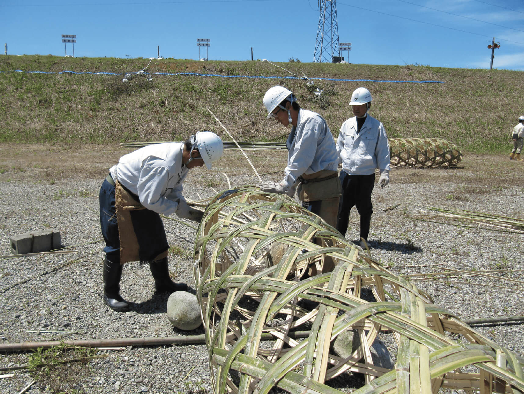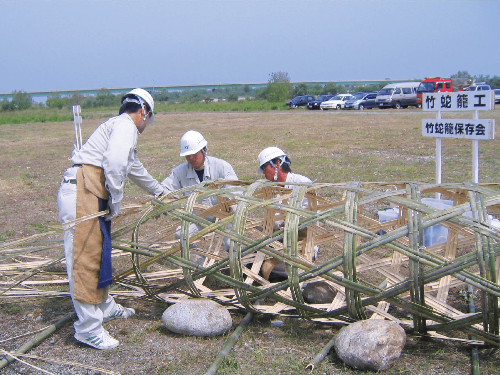 竹蛇籠の製作は、親から子へそれぞれの家の技として引き継がれてきたため、職人の数は限られていました。加えて、工事の機械化や職人の高齢化に伴い、技術 の継承が大きな課題となっていました。