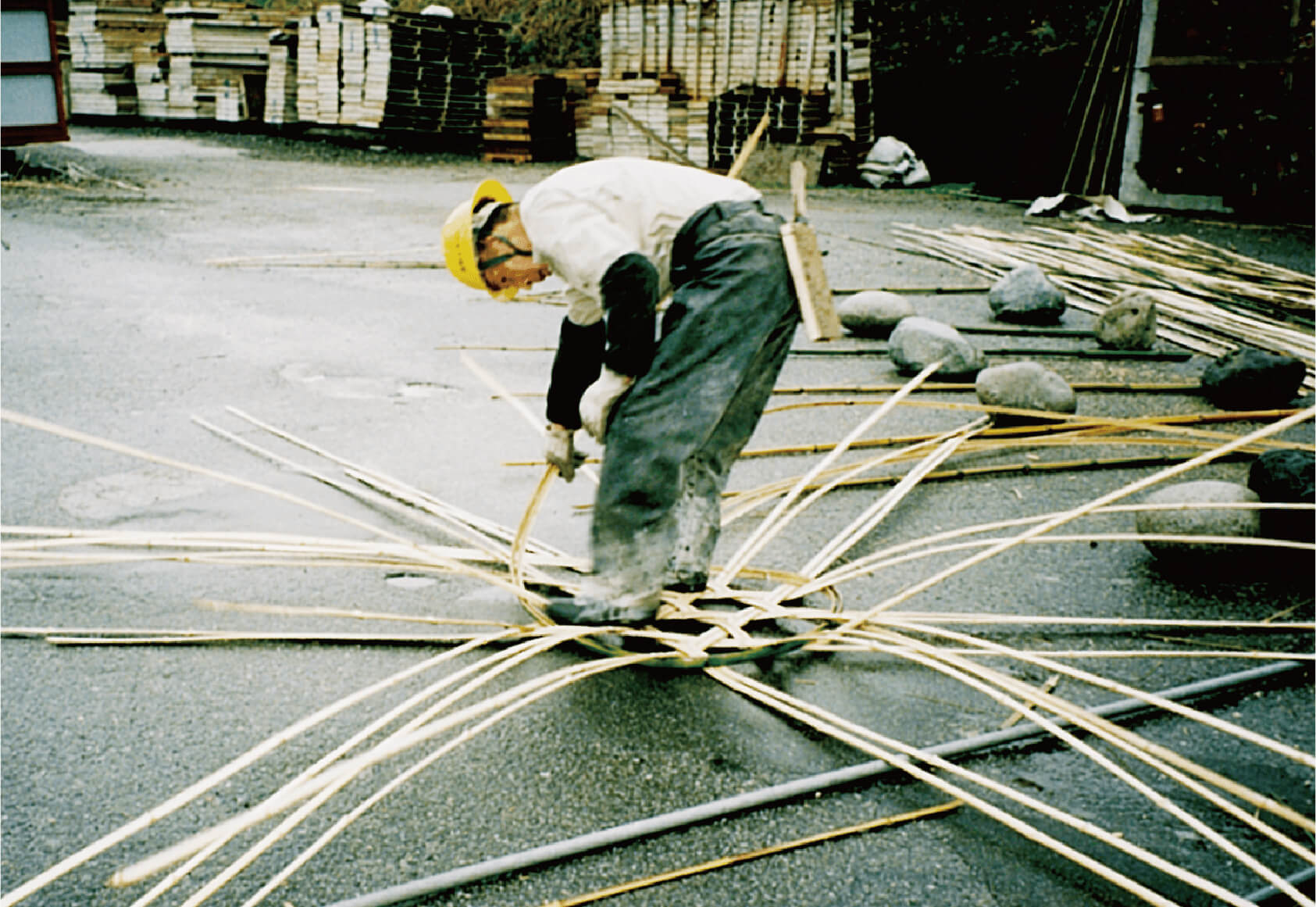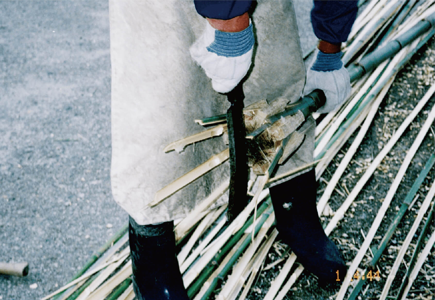 斜めに切った竹の切り口に裂け目を入れ、2.5センチ程度の幅になるように木具とハンマーで均等に割っていくのですが、 幅もバラバラ、節のところで割れずに止まってしまうこともしばしば。誰もが簡単に竹を割っていくので正直、 自分の不器用さに腹が立ったものです。竹を接いでいく際、曲げても折れない程度の柔かさにする、 その加減もわからないまま見よう見まねで竹の先端を削ぐ、結果的にまったく使い物にならないものが何本も出来あがっていました。
