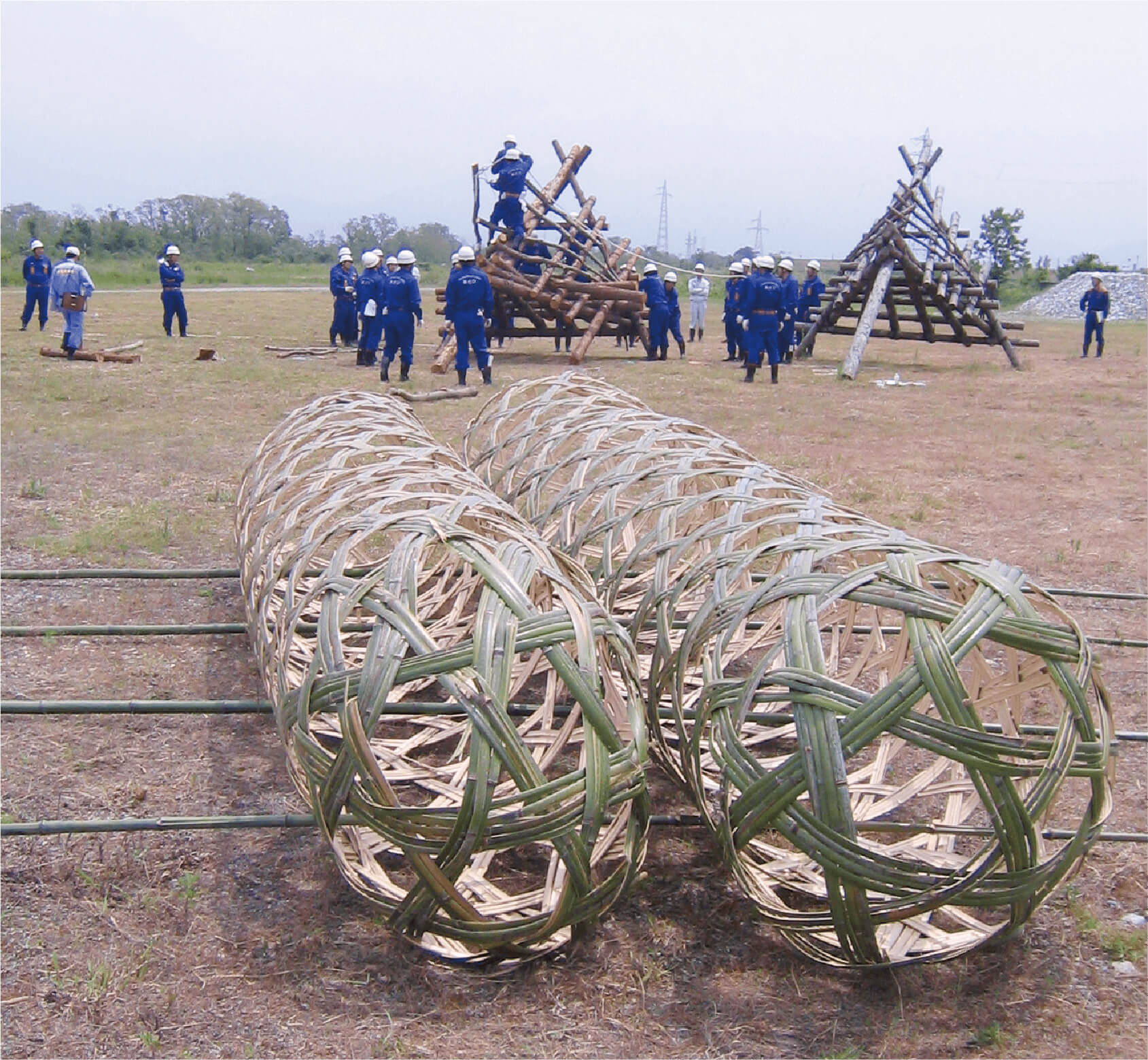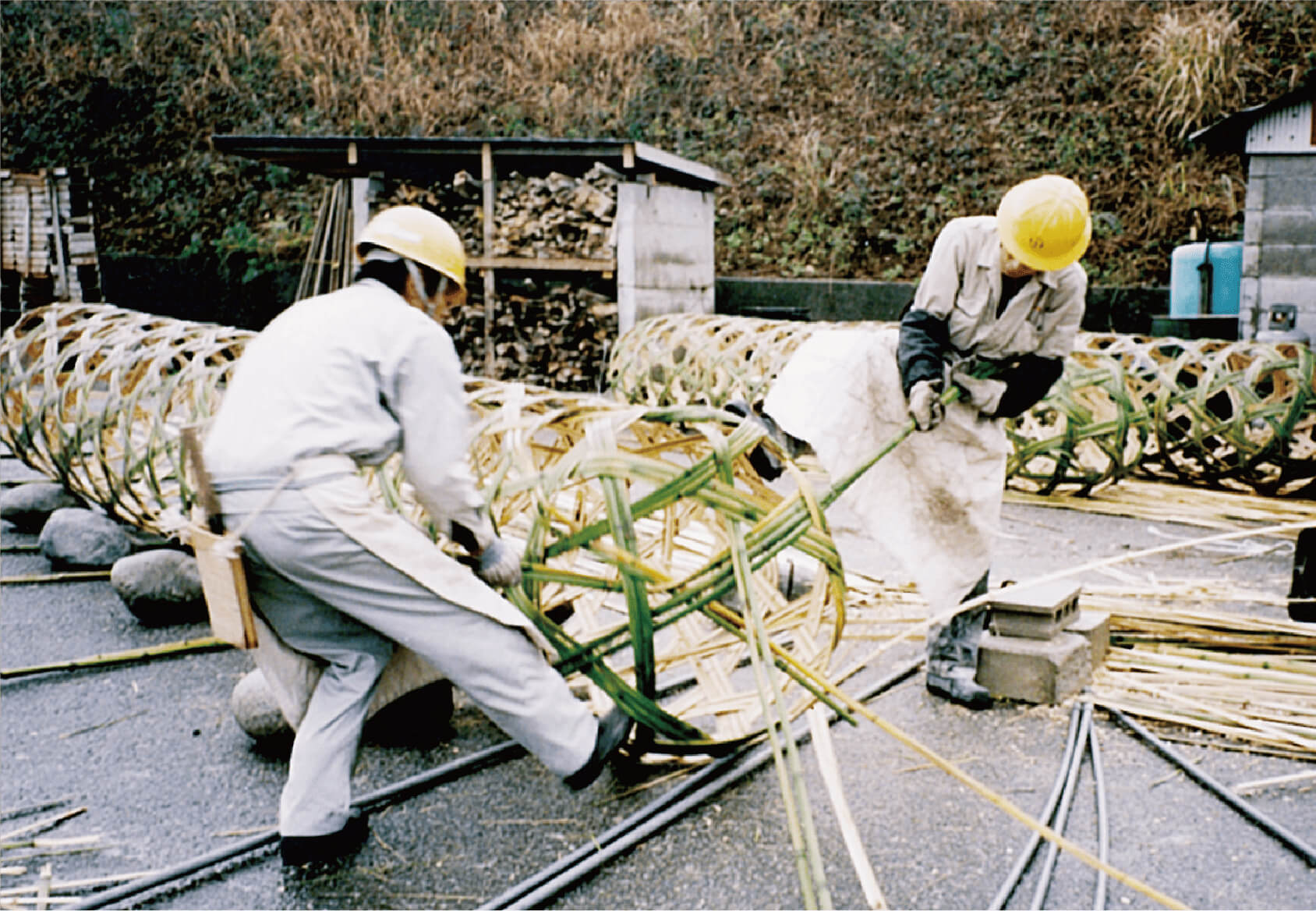 自然に優しく「多自然川づくり」にふさわしい土木材料として見直されている竹蛇籠(たけじゃかご)。