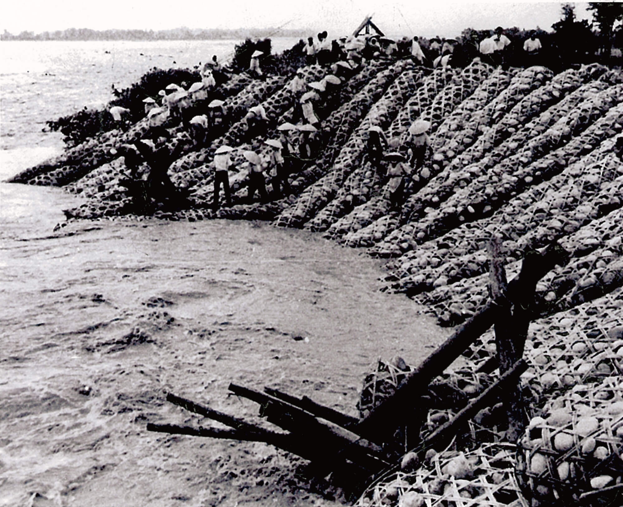 明治時代に富山県に招かれたオランダ人技師ヨハネス・デレーケも、この伝統技法を用いて築堤工事を行っており、 竹蛇籠は昭和40年代半ばまで黒部川の治水・利水工事に活躍しました。 竹蛇籠は、竹のしなりや石の重みを活かした工法として、 仮締め切り工、洪水時の堤防決壊防止工 法および川倉工と併用した水はね工、災害復旧の護岸工などに使われました。 必要なときにすぐに間にあうよう、家々の屋敷林や川べりには竹が植えられていました。