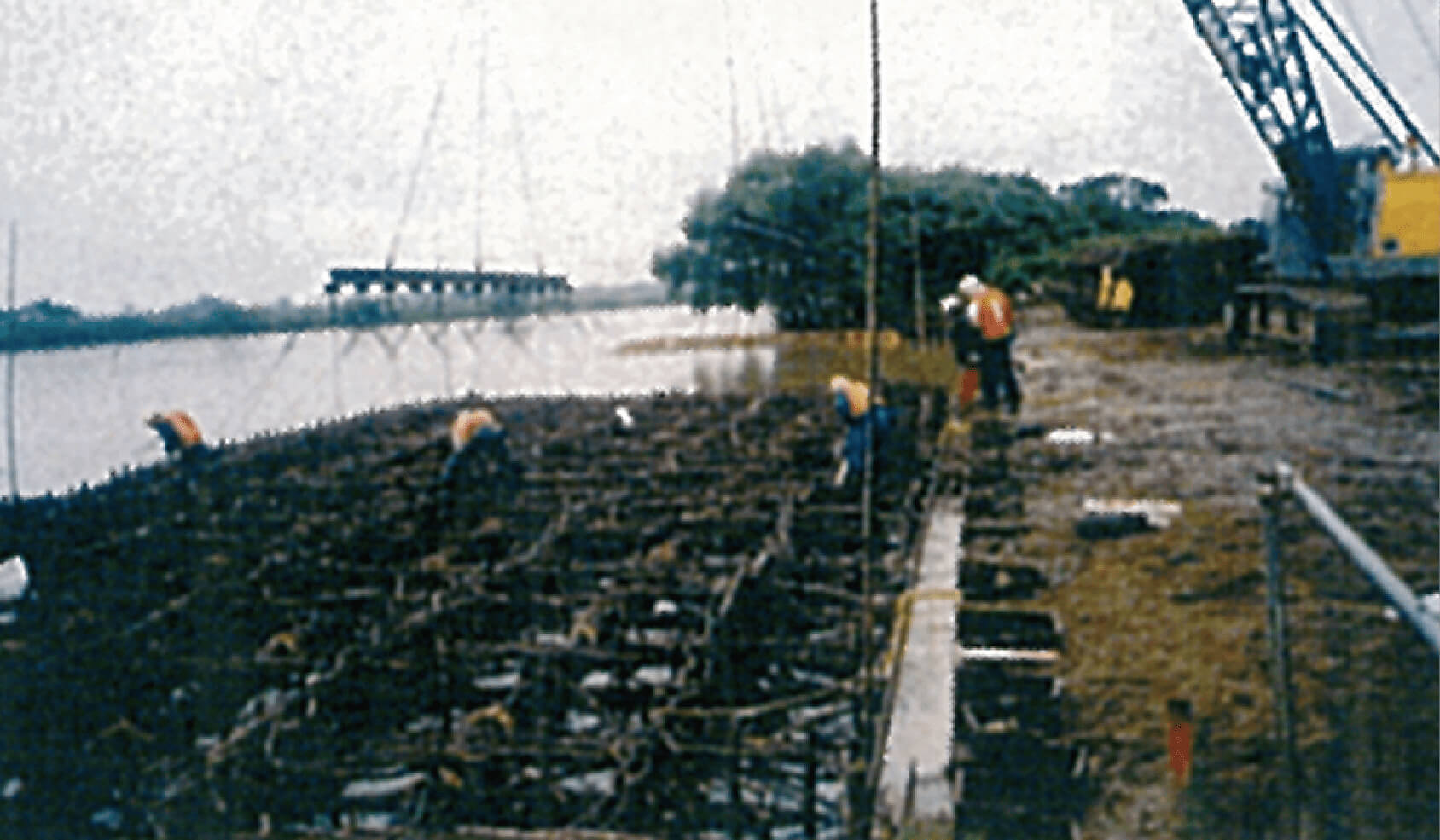 粗朶(そだ)とは、里山から切り出した雑木の枝のことで、これを格子状に組んだ沈床を皮に沈めて、 川床を守ります。