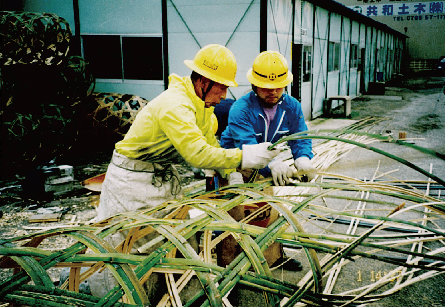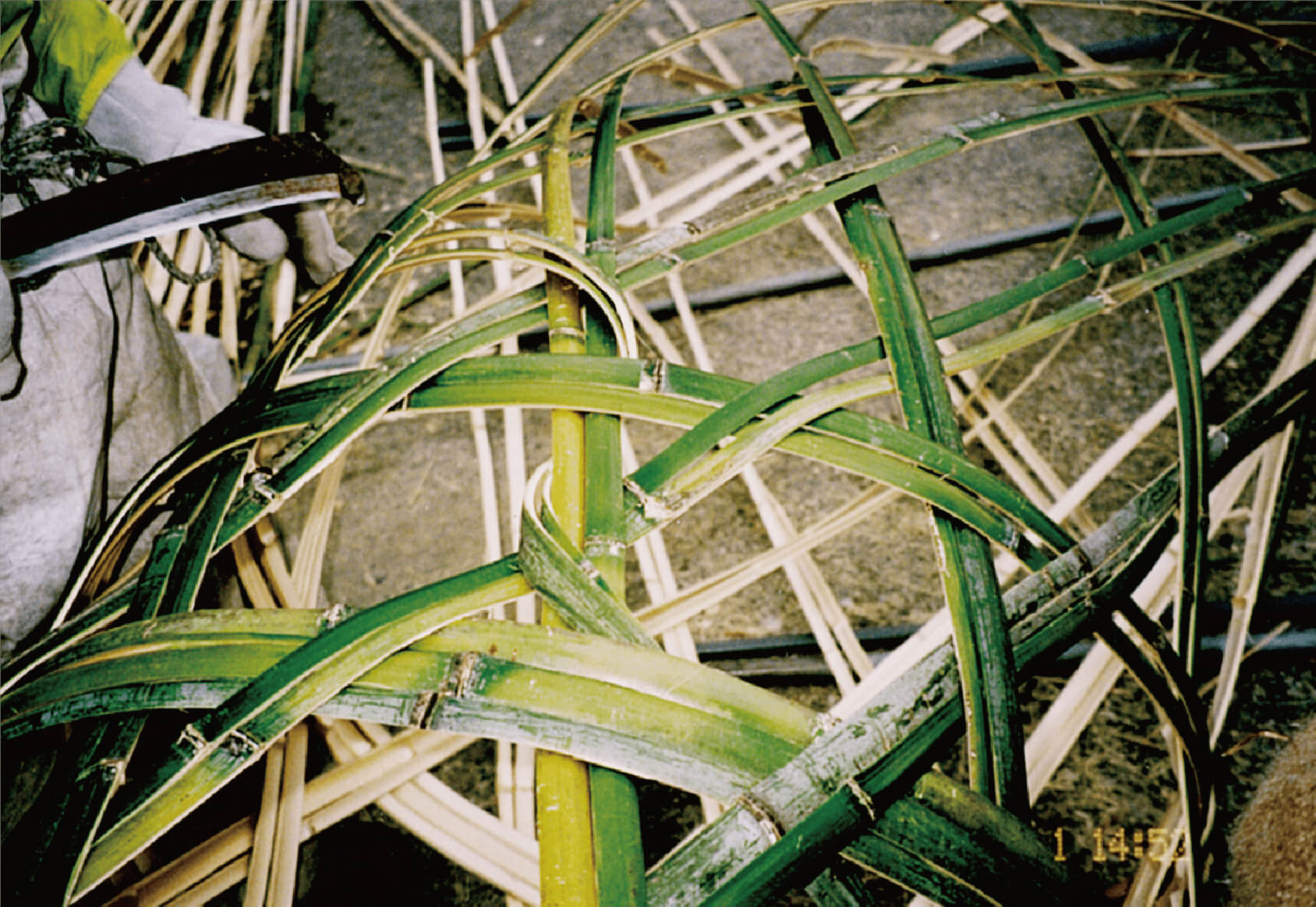 斜めに切った竹の切り口に裂け目を入れ、2.5センチ程度の幅になるように木具とハンマーで均等に割っていくのですが、 幅もバラバラ、節のところで割れずに止まってしまうこともしばしば。誰もが簡単に竹を割っていくので正直、 自分の不器用さに腹が立ったものです。竹を接いでいく際、曲げても折れない程度の柔かさにする、 その加減もわからないまま見よう見まねで竹の先端を削ぐ、結果的にまったく使い物にならないものが何本も出来あがっていました。
